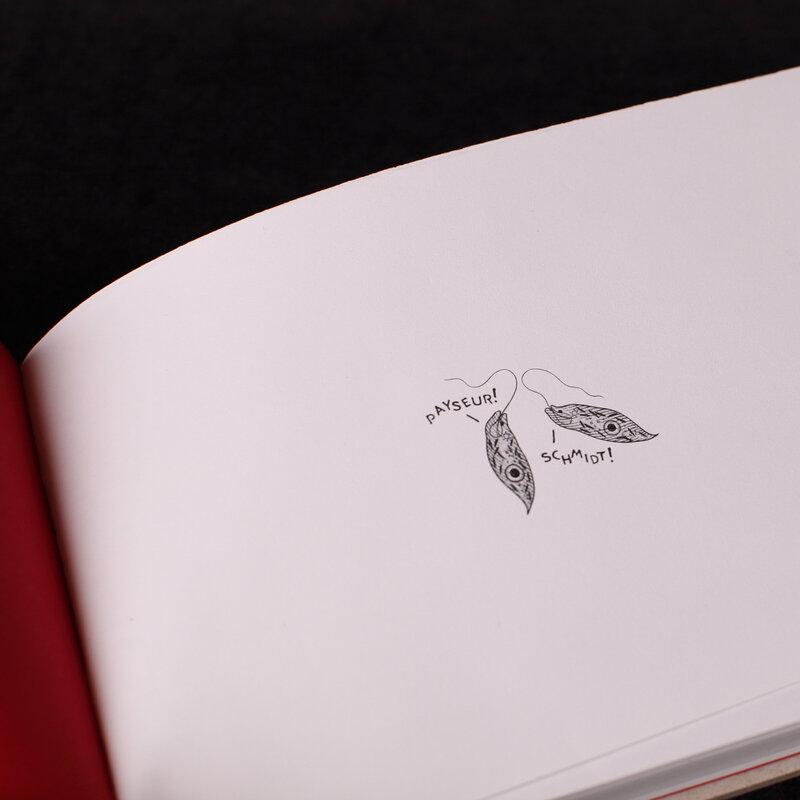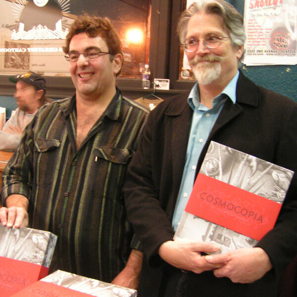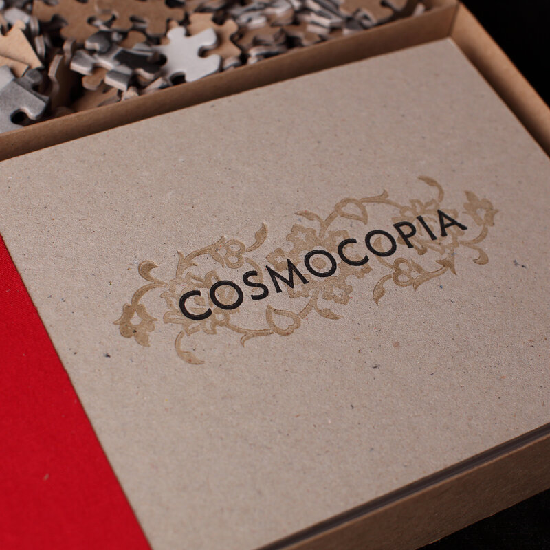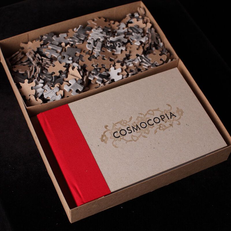 Published in 2008 by Jacob McMurray's small defunct art press Payseur & Schmidt, Cosmocopia was conceived as a collaboration between author DiFilippo and illustrator Jim Woodring. McMurray acted as the overall curator and designer for each component of the project (book, puzzle, print, packaging), integrating DiFilippo’s short novel and Woodring’s artwork into a unified book-as-art object that balances the pulp, surrealist art and novel with a restrained and bold modern layout and design.